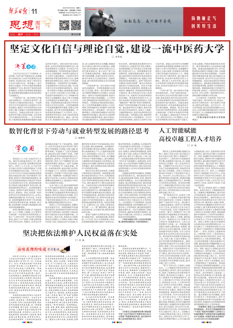 在学校第四次党代会胜利召开两周年之际,校党委书记乔学斌在新华日报《思想周刊》头条发表题为《坚定文化自信与理论自觉,建设一流中医药大学》的署名文章。文章深刻阐释了习近平总书记“中国特色、中国风格、中国气派”重要论述对一流中医药大学建设的指导意义,系统论述了以“中国特色”为显著标识、“中国风格”为实践路径、“中国气派”为境界追求的一流中医药大学办学方略与发展路径。文章是对学校第四次党代会战略目标的深度阐释与有力推进,为新征程上学校高质量发展进一步指明方向、凝聚力量。